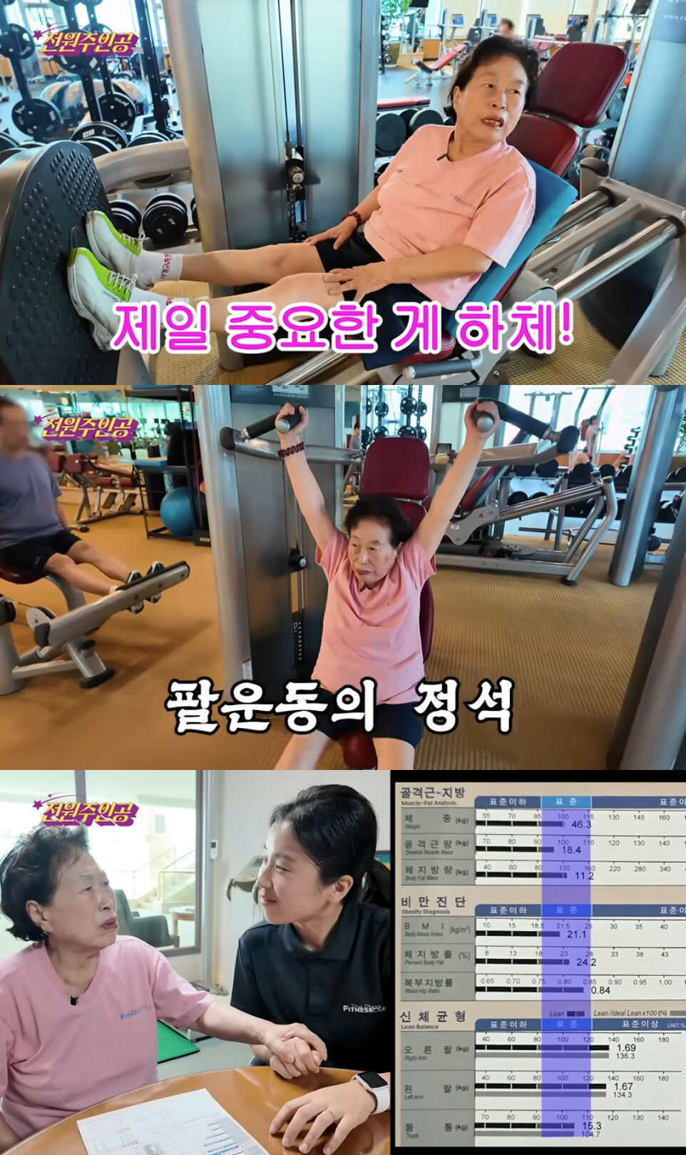 버스를 타고 헬스장에 도착한 전원주는 유산소 운동, 근력 운동, 마무리 스트레칭까지 빠짐없이 소화하며 86세라는 나이가 믿기지 않는 체력을 보여줬다. 그는 “나이 먹어서 제일 중요한 게 하체 근육이다. 동창 모임 가면 나만 지팡이 없이 걷는다”고 자랑했다. 전원주는 또 인바디 검사 결과를 보여주며 “전부 표준·정상이다”라고 직접 건강함을 인증했다.