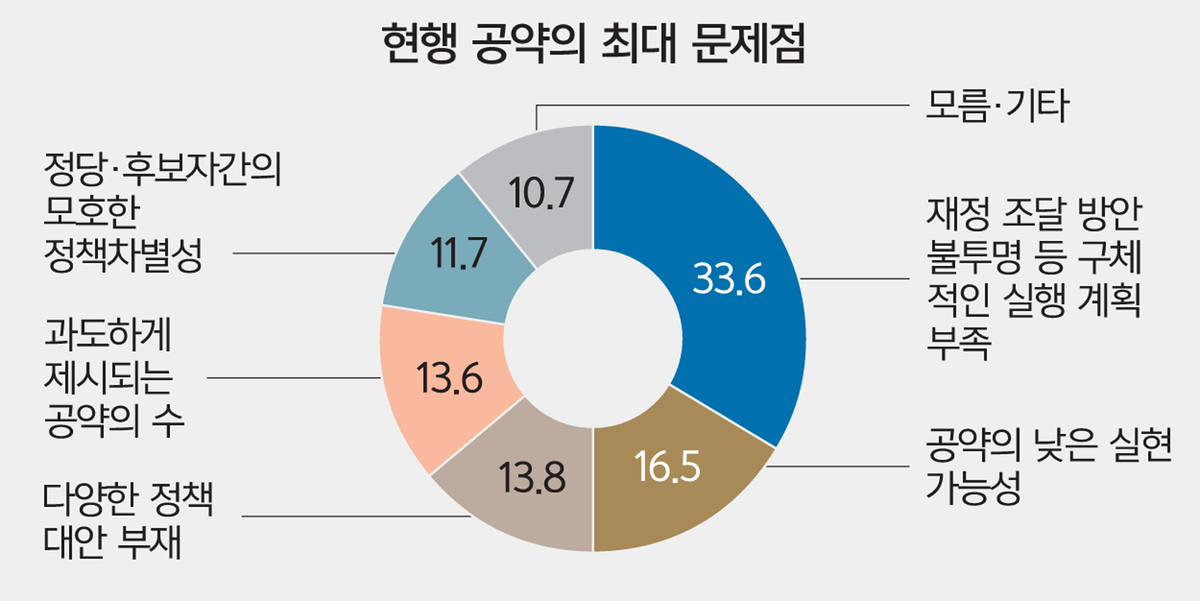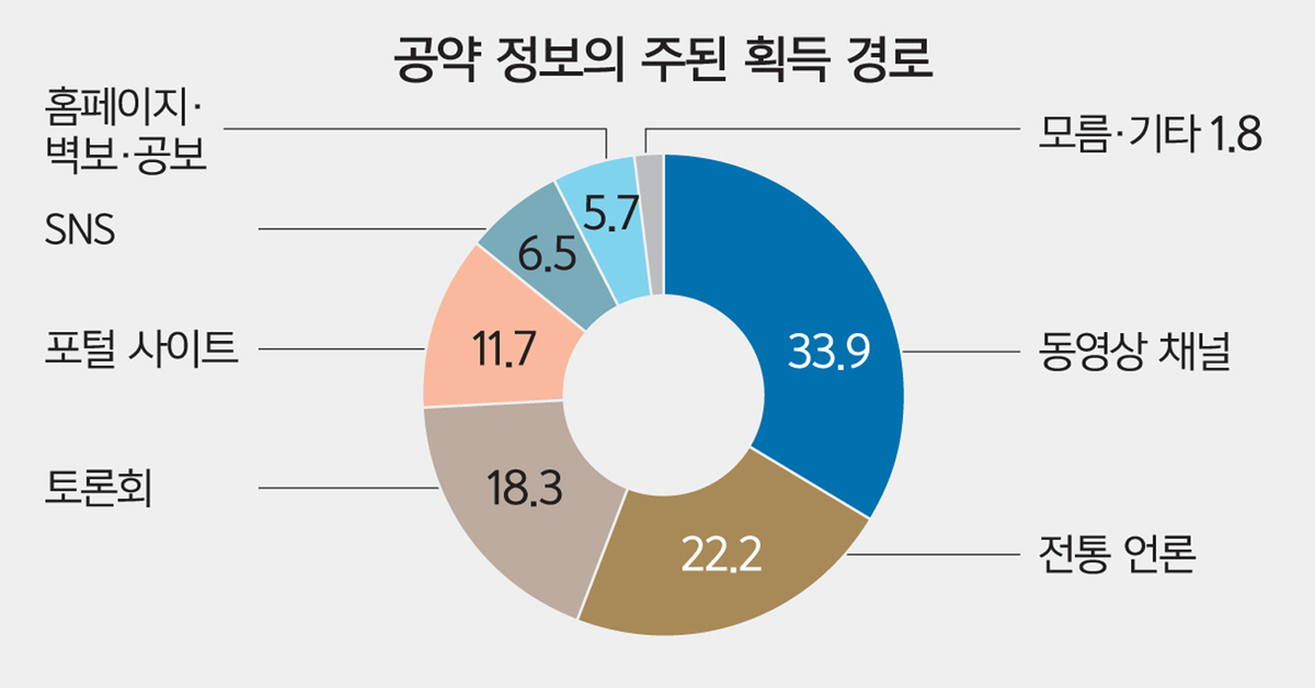 대선 기간 정책공약을 접한 경로로는 ‘유튜브, 네이버·다음 TV 등 동영상 채널’(33.9%)이 가장 많은 비중을 차지했다. 이어 ‘신문·TV·라디오 등 전통 언론’(22.2%), ‘선관위 주최 TV대담·토론회’(18.3%), ‘인터넷 포털 사이트’(11.7%) 순이었다. 세대별로는 40대(45.1%)와 50대(43.3%)의 동영상 채널 의존도가 특히 높았다. 20대는 동영상 채널(21.2%)과 전통 언론(21.4%)을 비슷한 비율로 이용했다. 대선 공약의 가장 큰 문제점으로는 유권자 3명 중 1명(33.6%)이 ‘재정 조달 방안 불투명 등 구체적인 실행 계획 부족’을 지적했다. 이어 ‘낮은 실현 가능성’(16.5%), ‘다양한 정책 대안 부재’(13.8%), ‘과도하게 제시되는 공약의 수’(13.6%) 순이었다.