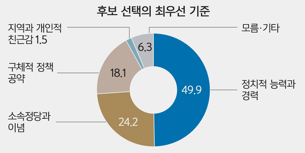 이념성향별로는 뚜렷한 차이를 보였다. 보수층은 ‘소속정당과 이념’(37.5%)을 1순위로 꼽았지만, 진보층과 중도층은 각각 ‘정치적 능력과 경력’을 59.1%, 59.3%로 가장 많이 선택했다.